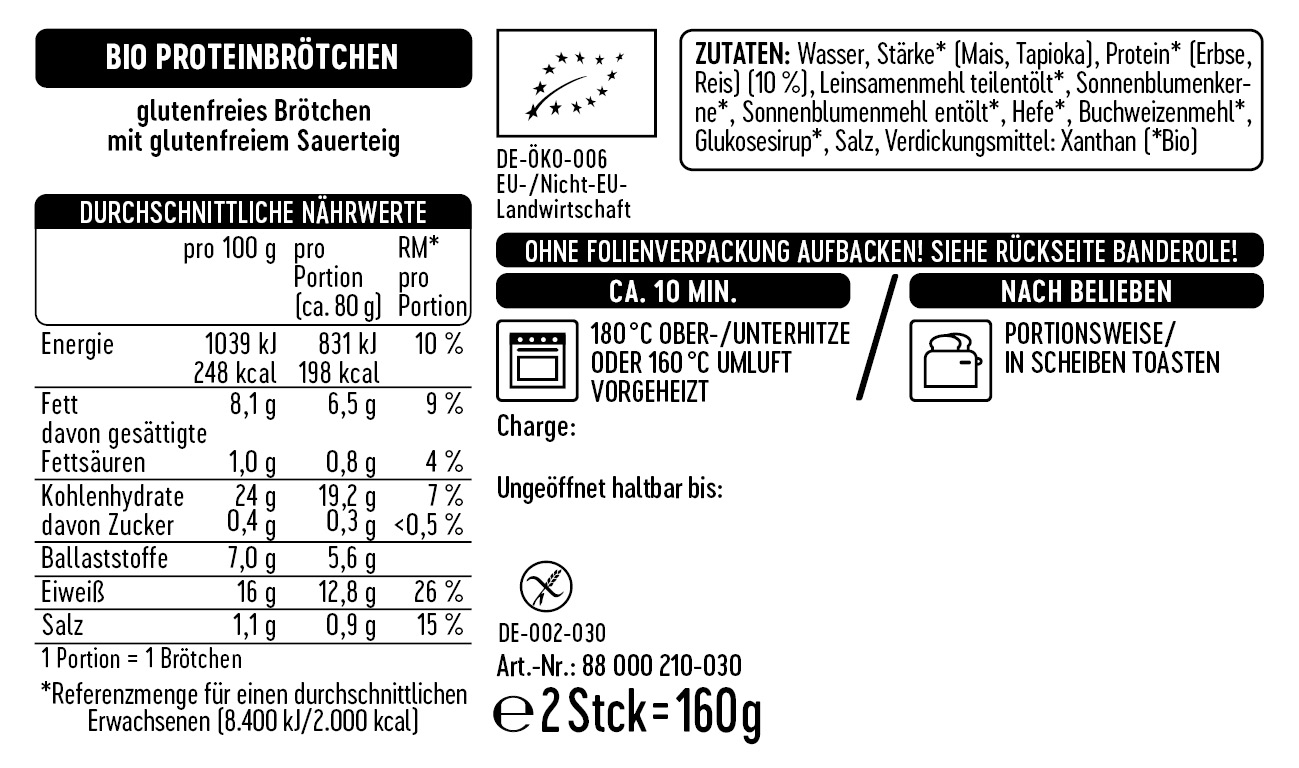 Wasser, Stärke* (Mais, Tapioka), Protein* (Erbse, Reis) (10%), Leinsamenmehl teilentölt*, Sonnenblumenkerne*, Sonnenblumenmehl entölt*, Hefe*, Buchweizenmehl*, Glukosesirup*, Salz, Verdickungsmittel: Xanthan (*Bio)