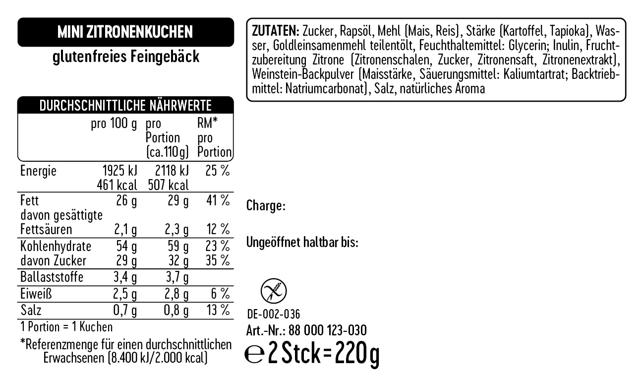 Zucker, Rapsöl, Mehl (Mais, Reis), Stärke (Kartoffel, Tapioka), Wasser, Goldleinsamenmehl teilentölt, Feuchthaltemittel: Glycerin; Inulin, Fruchtzubereitung Zitrone (Zitronenschalen, Zucker, Zitronensaft, Zitronenextrakt), Weinstein-Backpulver (Maisstärke, Säuerungsmittel: Kaliumtartrat; Backtriebmittel: Natriumcarbonat), Salz, natürliches Aroma