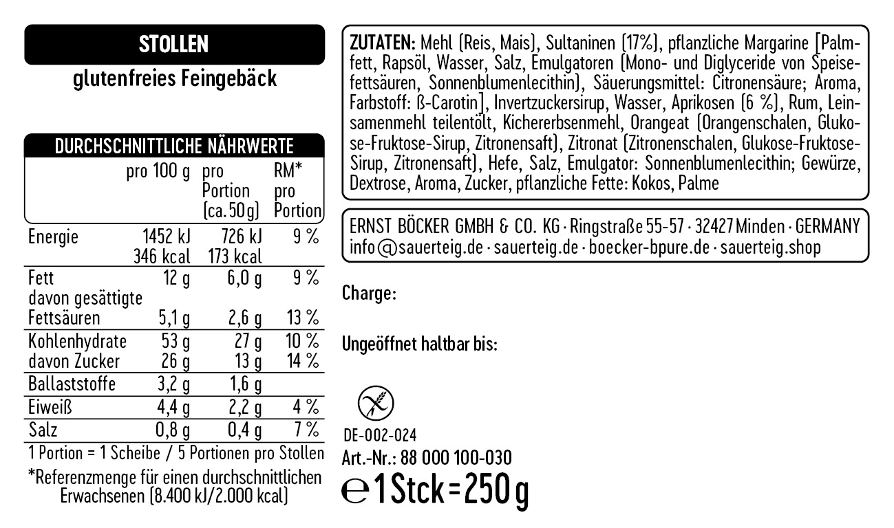 Mehl (Reis, Mais), Sultaninen (17%), pflanzliche Margarine [Palmfett, Rapsöl, Wasser, Salz, Emulgatoren (Mono- und Diglyceride von Speisefettsäuren, Sonnenblumenlecithin), Säuerungsmittel: Citronensäure; Aroma, Farbstoff: ß-Carotin], Invertzuckersirup, Wasser, Aprikosen (6 %), Rum, Leinsamenmehl teilentölt, Kichererbsenmehl, Orangeat (Orangenschalen, Glukose-Fruktose-Sirup, Zitronensaft), Zitronat (Zitronenschalen, Glukose-Fruktose-Sirup, Zitronensaft), Hefe, Salz, Emulgator: Sonnenblumenlecithin; Gewürze, Dextrose, Aroma, Zucker, pflanzliche Fette: Kokos, Palme