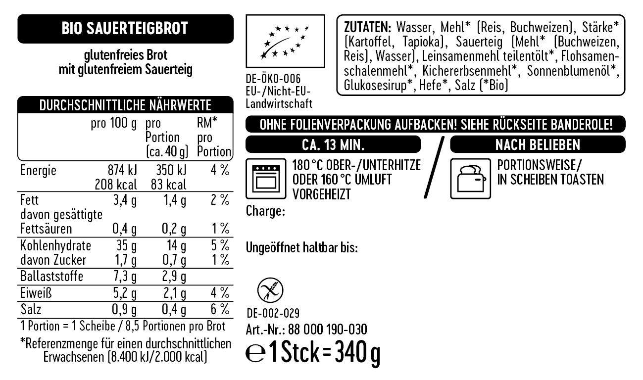 Wasser, Mehl* (Reis, Buchweizen), Stärke* (Kartoffel, Tapioka), Sauerteig (Mehl* (Buchweizen, Reis), Wasser), Leinsamenmehl teilentölt*, Flohsamenschalenmehl*, Kichererbsenmehl*, Sonnenblumenöl*, Glukosesirup*, Hefe*, Salz (*Bio)
