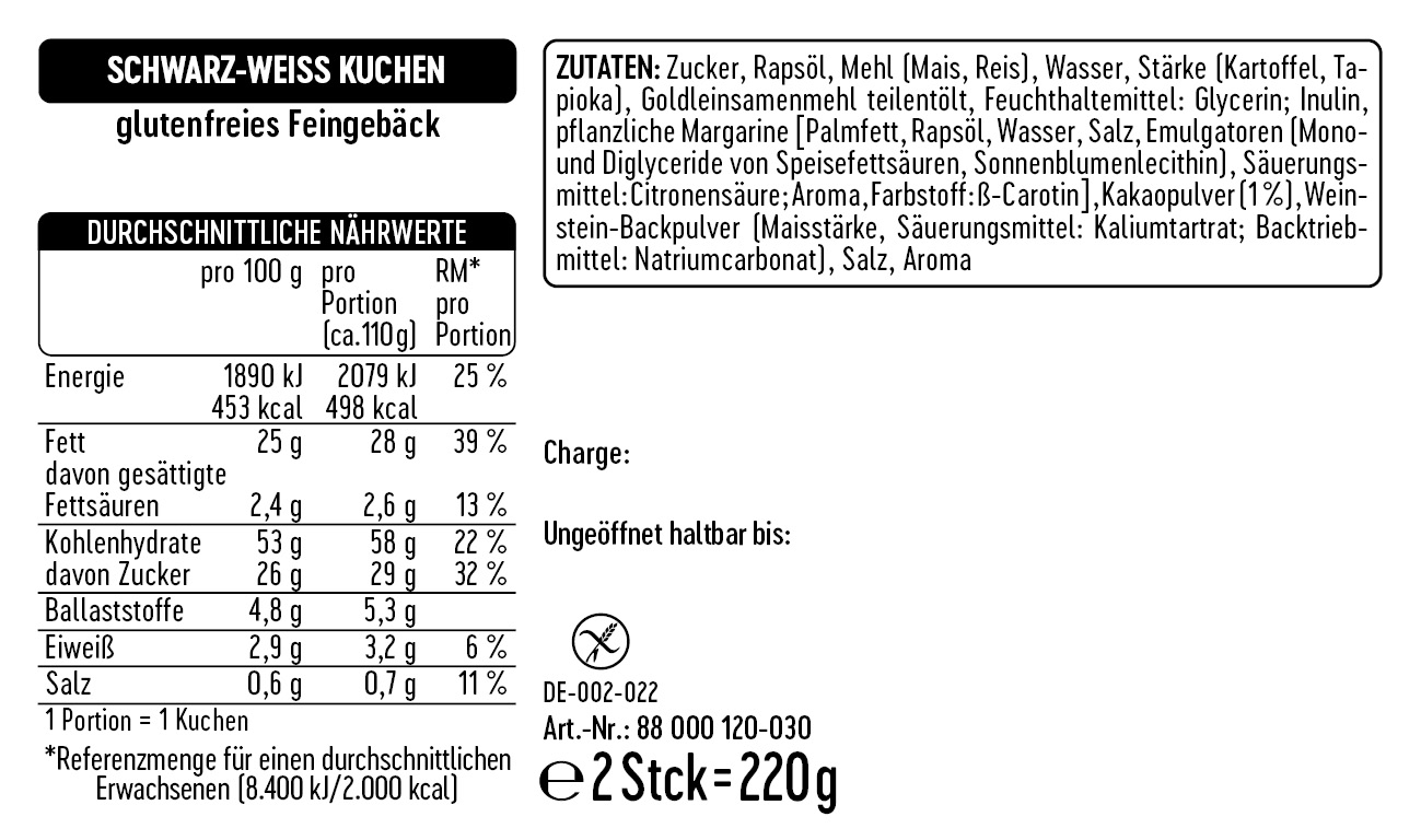 Zucker, Rapsöl, Mehl (Mais, Reis), Wasser, Stärke (Kartoffel, Tapioka), Goldleinsamenmehl teilentölt, Feuchthaltemittel: Glycerin; Inulin, pflanzliche Margarine [Palmfett, Rapsöl, Wasser, Salz, Emulgatoren (Mono- und Diglyceride von Speisefettsäuren, Sonnenblumenlecithin), Säuerungsmittel: Citronensäure; Aroma, Farbstoff: ß-Carotin], Kakaopulver (1 %), Weinstein-Backpulver (Maisstärke, Säuerungsmittel: Kaliumtartrat; Backtriebmittel: Natriumcarbonat), Salz, Aroma
