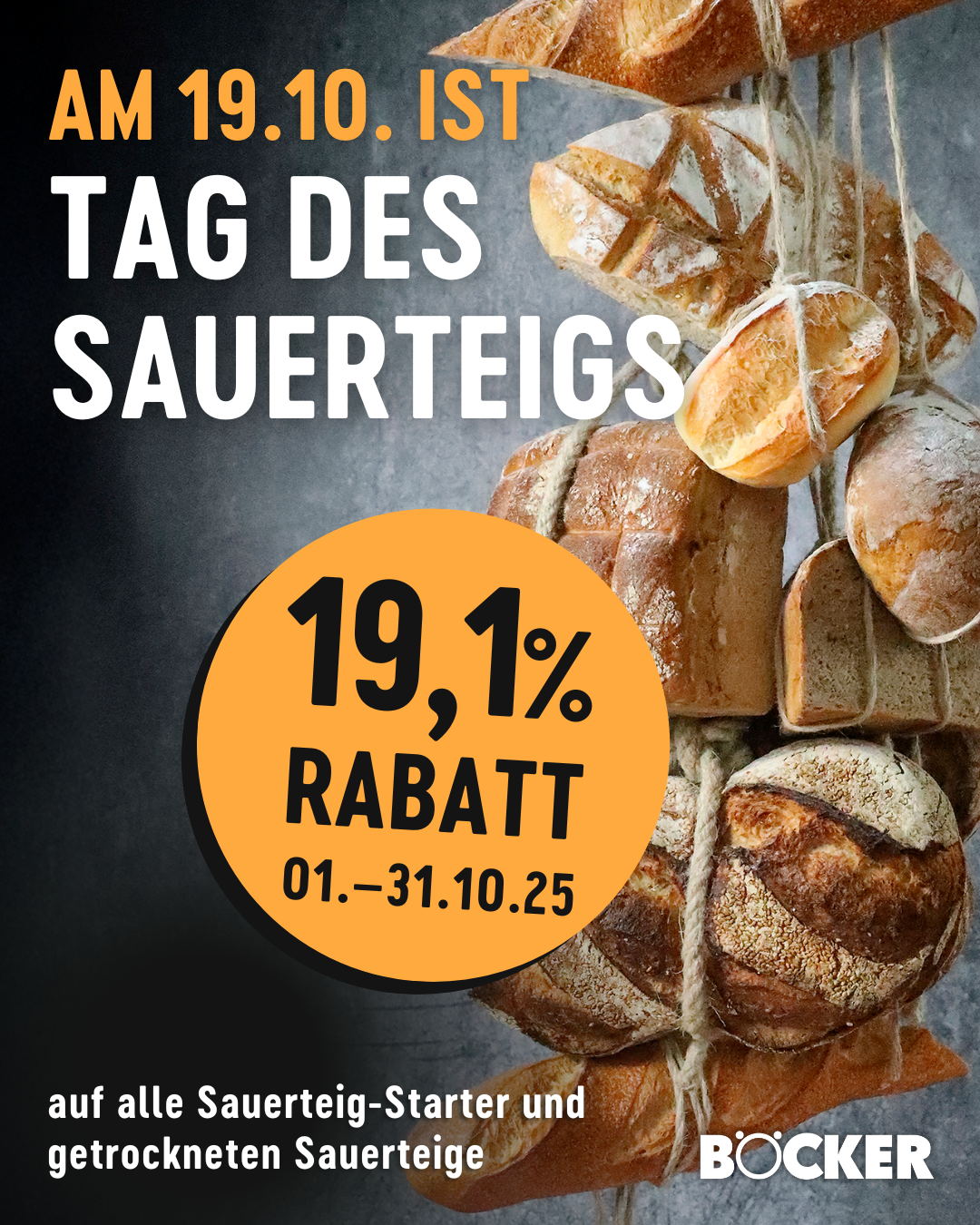 Passend dazu erhältst du vom 01.10. bis 31.10. ganze 19,1% Rabatt auf all unsere aktiven Sauerteig-Starter und getrockneten Sauerteige hier im Shop. Ob du dein erstes Brot backen oder dich an neue Sauerteig-Köstlichkeiten wagen möchtest – jetzt ist der perfekte Zeitpunkt, mit Sauerteig durchzustarten.